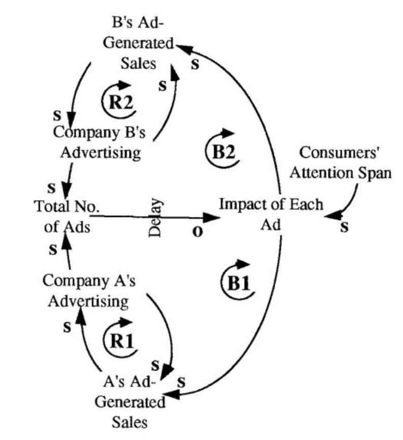 In the advertisers’ version of the “Tragedy of the Commons” (see “‘Overgrazing’ of Consumers”), each company’s advertising efforts leads to more ad generated sales (R1 and R2). As every product and service gets advertised, the total number of ads increase and, over time, the impact of each ad diminishes. This has a negative effect on sales and eventually leads to reductions in advertising (BI and B2).