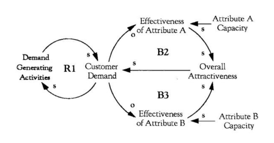The structure seduces you into responding to each capacity shortfall as an isolated problem, because the market response dictates which of your attributes is deteriorating at any point in time. The lesson of the structure is to recognize that being “all things to all people” is not a sustainable strategy and that you need to choose the set of attributes in which you want to be the most attractive.