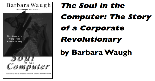 Eighteen years ago, Barbara Waugh changed her tactics for fulfilling her lifelong dream of creating a better world. The feminist theologian, radical activist, psychologist, and news columnist departed the nonprofit sector to promote transformation from inside corporate America. Hired by Hewlett-Packard as a staffing manager, Waugh was soon propelled to the forefront of HP’s worldwide change initiatives. Her memoir, The Soul in the Computer: The Story of a Corporate Revolutionary (Inner Ocean, 2001, written with Margot Silk Forrest), documents her efforts to encourage the ingenuity and altruism of employees and to help HP more clearly define itself as a global corporate citizen.