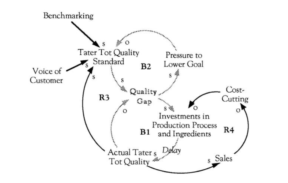 If actual quality and the quality standard are linked together, qualitymay appear toremain the same from year to year even as it decreases (R3). If deteriorating quality results in a decrease in sales, the company may cut back on investments, further accelerating the quality deterioration (R4).