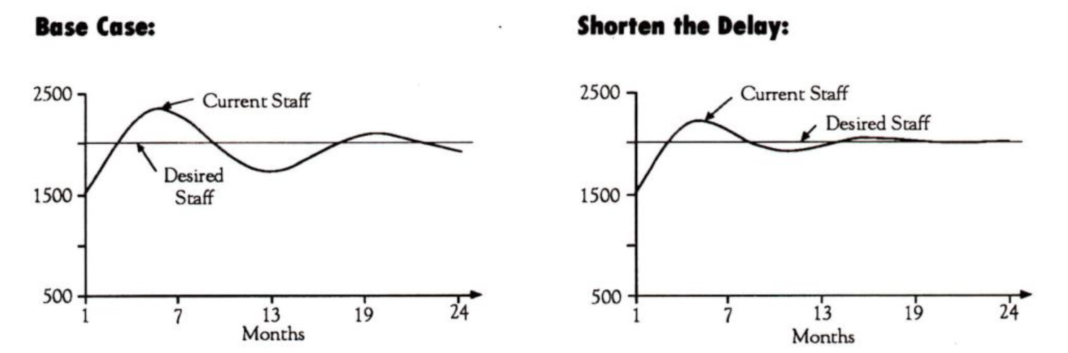 These two scenarios compare possible staffing strategies. As the right-hand graph shows, shortening the hiring delay to two months allows us to approach ow target number more smoothly.